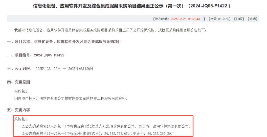 变更原因显示,原预中标人北明软件被暂停参加某单位物资工程服务采购资格。据运营商财经网此前报道,2025年7月29日,北明软件有限公司因在参加某项目采购活动中,涉嫌存在违规失信行为,被某系统暂停投标资格。