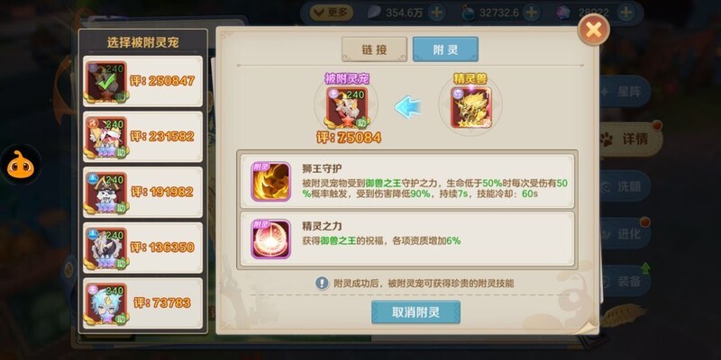 挑战魂兽之庭时,有条件的玩家可临时使用狮子附灵来增强部分魂兽的战力,效果更佳。相比其他精灵兽,狮子附灵提升的资质高出1%,是较为理想的选择。