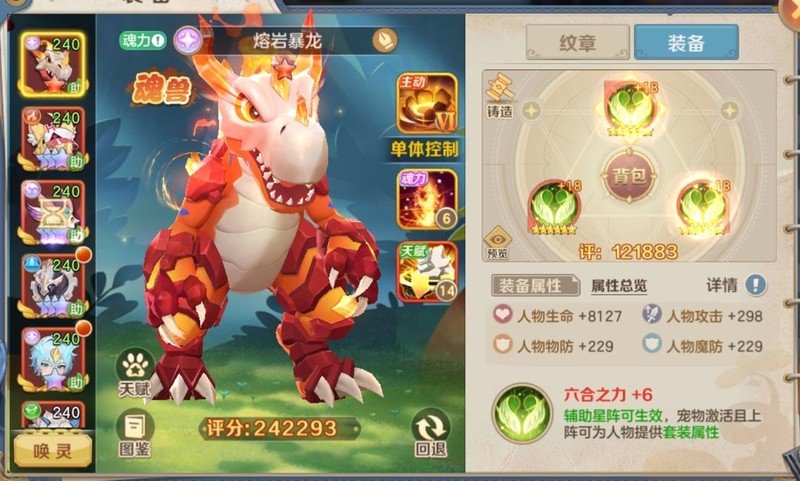 挑战魂兽之庭副本时,老区玩家可将辅助星阵宠物的六合之力三件套临时装备给暴龙,有助于提升战力。若觉得频繁更换麻烦,也可直接在暴龙身上长期装备辅助星阵三号位,即便星阶不高也无妨,因该位置属性加成较低,影响较小。新区玩家在六合之力尚未开放前,可选择穿戴破灭之力套装,四星及以上且带有套装属性的即可使用。