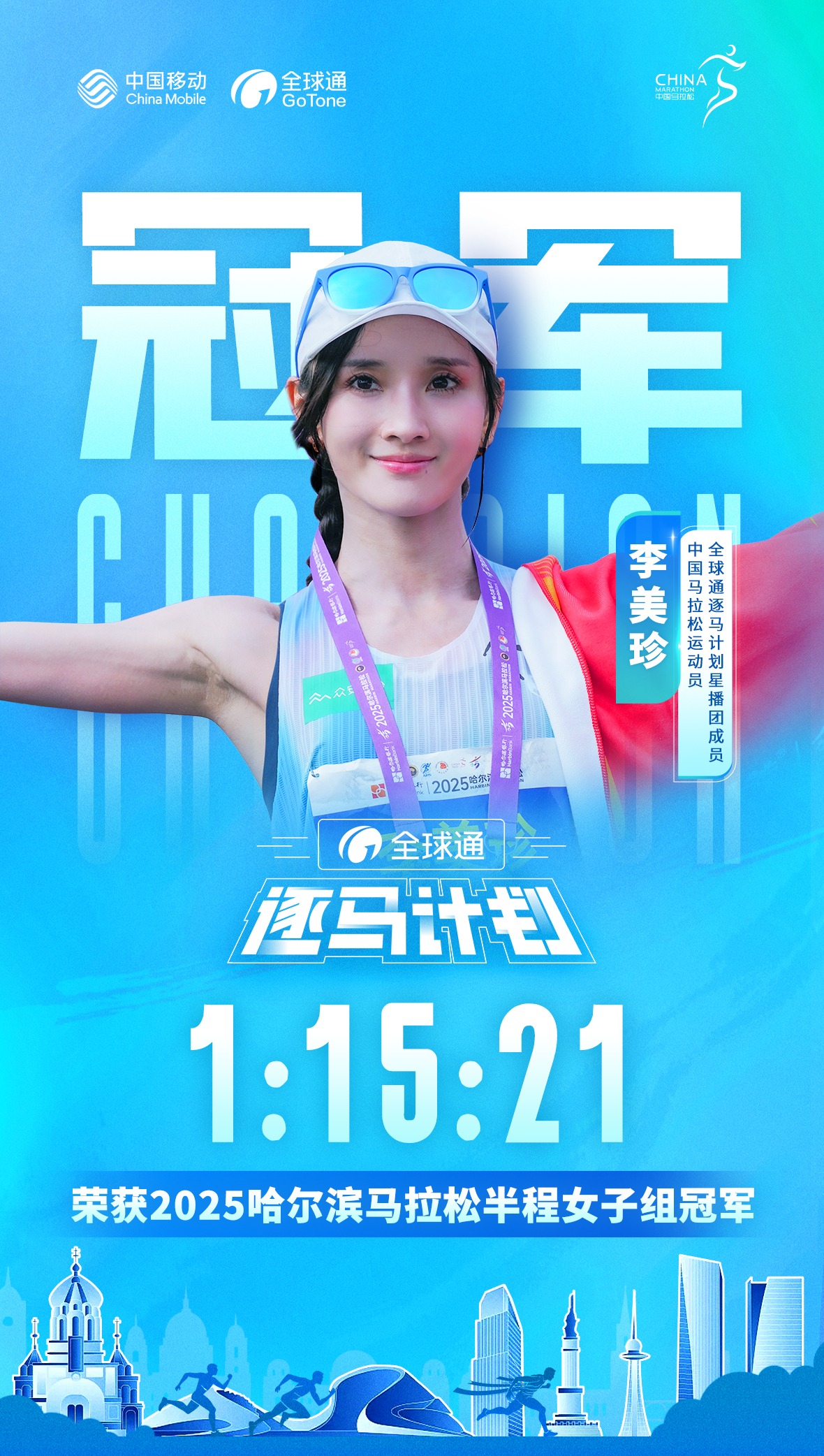 鸣枪起跑,万人齐发!8月31日,哈尔滨音乐长廊成为激情与浪漫的起点。三万余跑者穿梭于欧式建筑与松花江畔,宛如一幅流动的“东方莫斯科”画卷。经过激烈角逐,“全球通·逐马计划”星播团成员李美珍以1:15:21的优异成绩荣获哈尔滨马拉松半程女子组冠军。在这场夏日收官跑马盛宴中,中国移动“全球通·逐马计划”再度升级,以“头等舱”级服务将42.195公里的竞技赛道,拓展为“跑一场马,游一座城” 的沉浸式探索之旅。