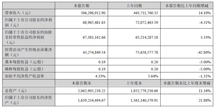 容大感光(300576)上半年实现营业收入 5.06 亿元,同比增长 14.10%,在行业波动背景下保持了营收规模的稳步扩张。尽管归母净利润同比略有下滑 4.31% 至 6896.55 万元,但扣除非经常性损益后的归母净利润同比增长 3.33% 达 6738.32 万元,凸显主营业务的盈利韧性。