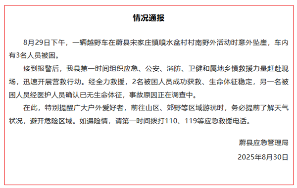 经全力救援,2名被困人员成功获救、生命体征稳定,另一名被困人员经医护人员确认已无生命体征,事故原因正在调查中。
