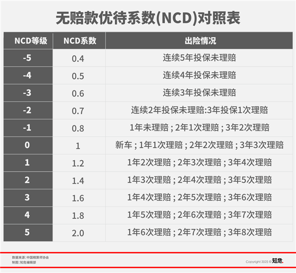 在这个公式中,无赔款优待系数( NCD 系数,no-claim discount )是商业险中为数不多与车主驾驶行为直接挂钩的变量。