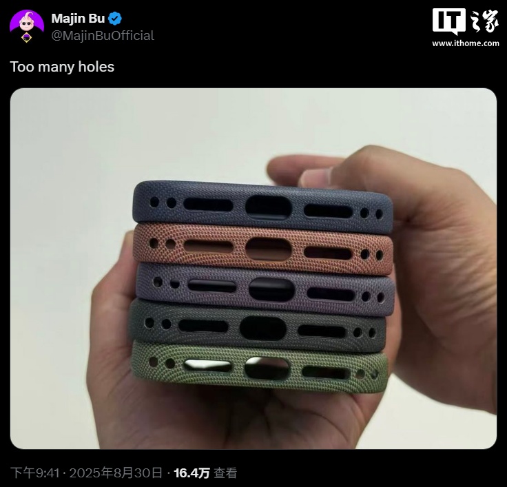 IT之家注意到,Majin Bu 还曝光了 iPhone 17 系列“TechWoven”保护壳,采用多彩编织面料,可以看到底部开孔数量颇多,预计是为新的挂绳配件铺路。