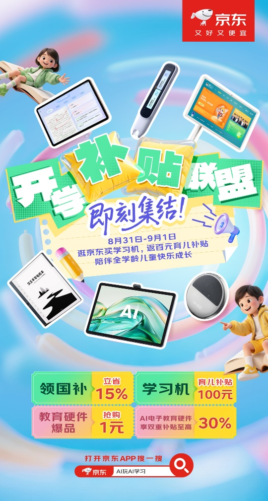 今年以来,多地陆续推行育儿补贴政策,不少家庭已进入3600元国家补贴申领阶段,为孩子的早期成长提供了有力支持。伴随教育数字化进程加速,AI辅助学习正成为家庭教育的新趋势。值此京东电教超级品类日高潮期,8月31日,京东宣布进一步加码育儿补贴,联合科大讯飞、学而思、有道、阿尔法蛋、小度、望远鲸、文石、汉王、来画等多家知名品牌,共同发起“开学补贴联盟”,带来国家补贴立省15%、学习机专享100元育儿补贴、教育硬件1元抢购、AI电子教育硬件双重补贴至高30%等多重优惠,陪伴全学龄儿童智慧学习、快乐成长。