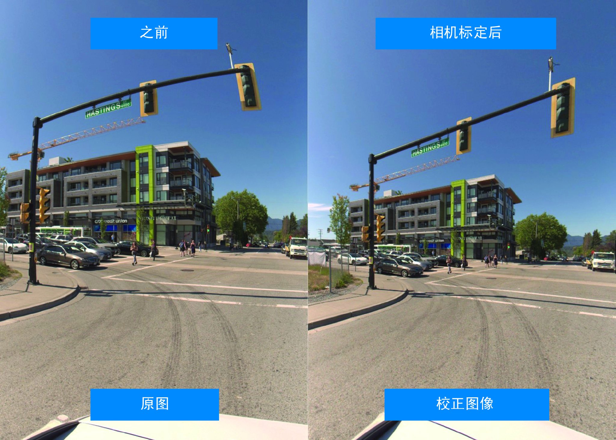 观察交通灯杆和建筑物边缘:在原始图像中,镜头畸变导致可见的曲率。校准后,直线将被恢复,这对于移动测绘中激光雷达和空间数据的精确对准至关重要。