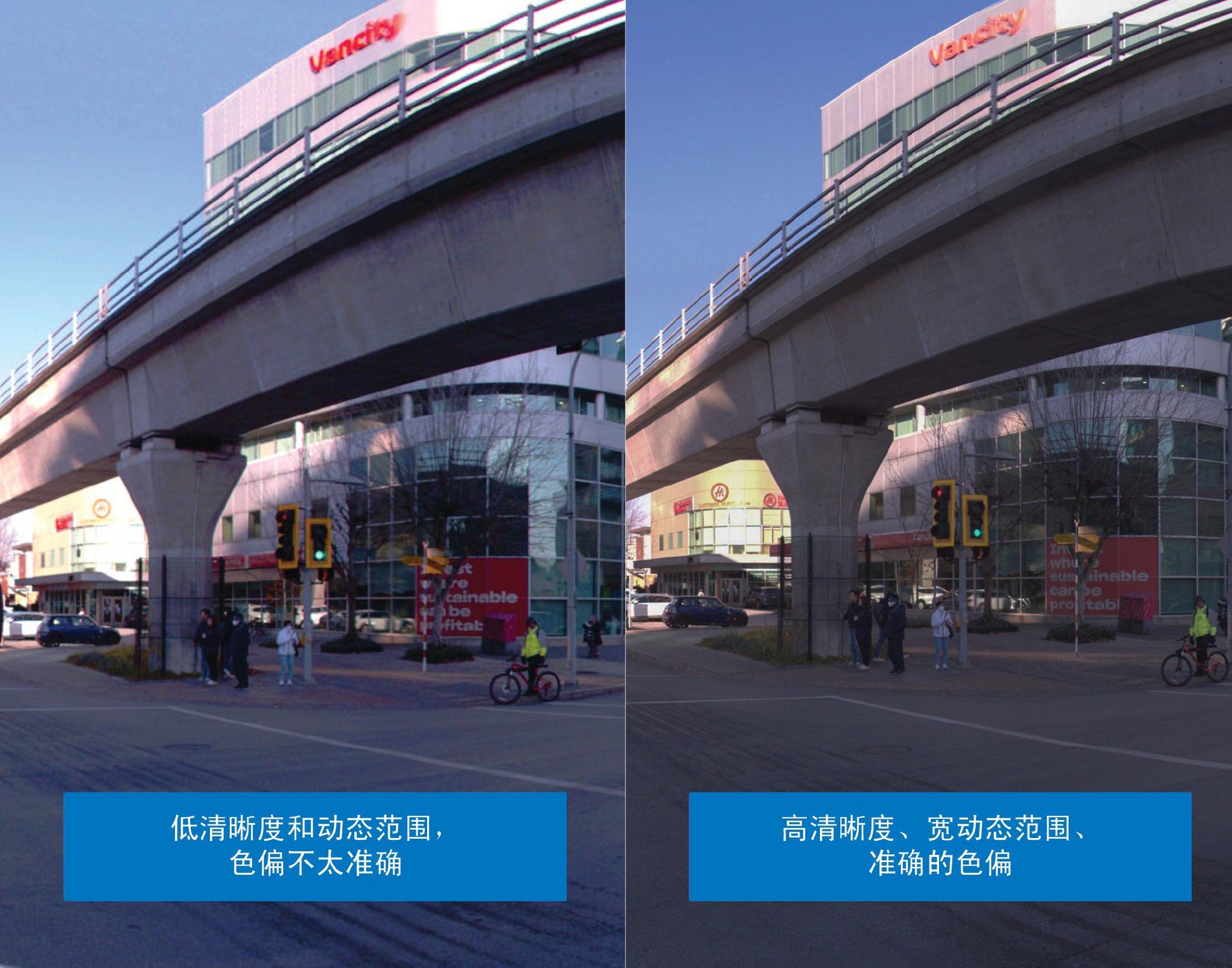 比较招牌徽标、交通灯边缘和建筑物阴影:右侧显示更清晰的细节、均衡的曝光和更自然的色彩,这对于准确的 AI 分割和映射至关重要