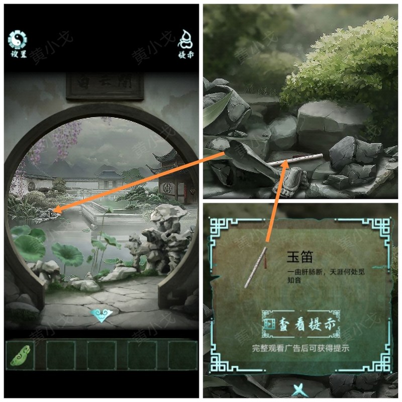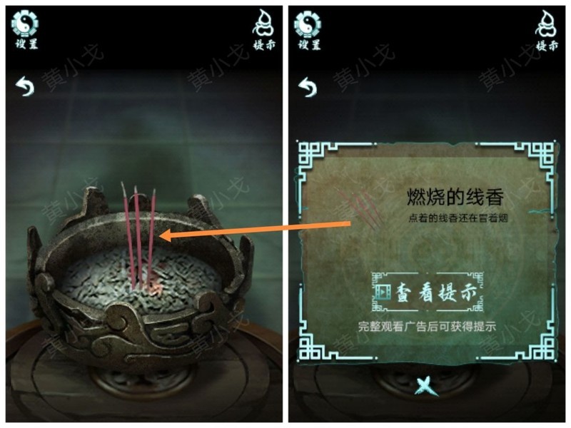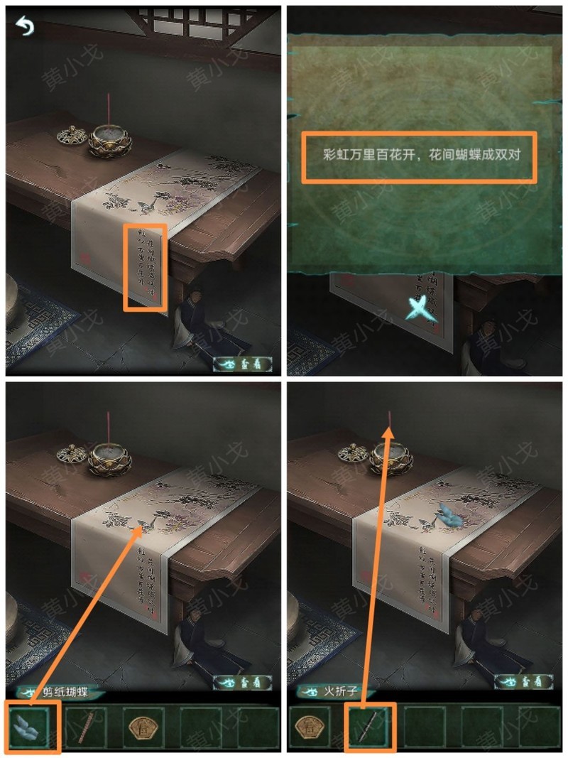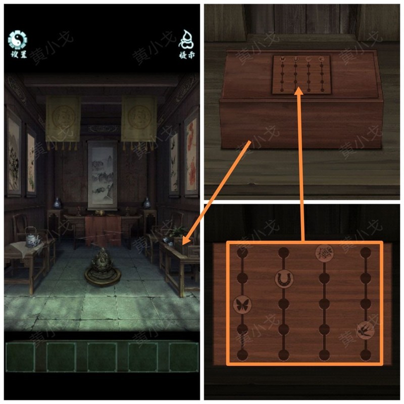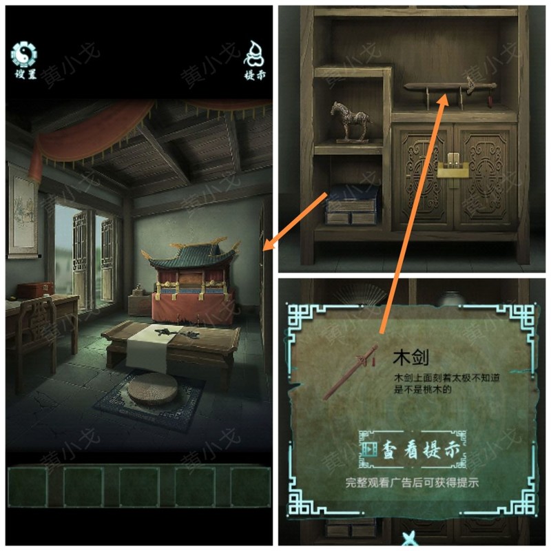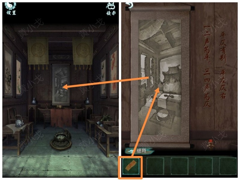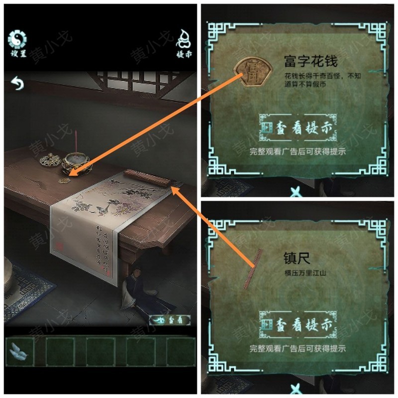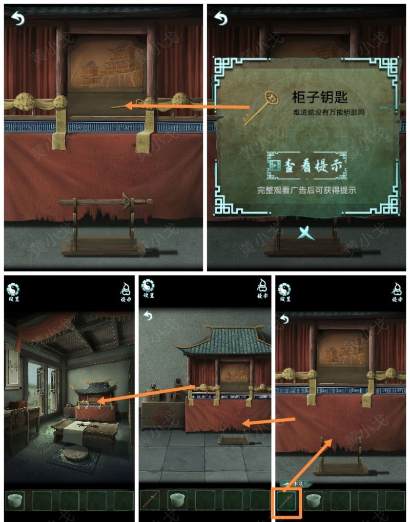 点击房间内的戏台,将镇尺放置架子上观看木偶戏,随后在戏台处取得火折子。