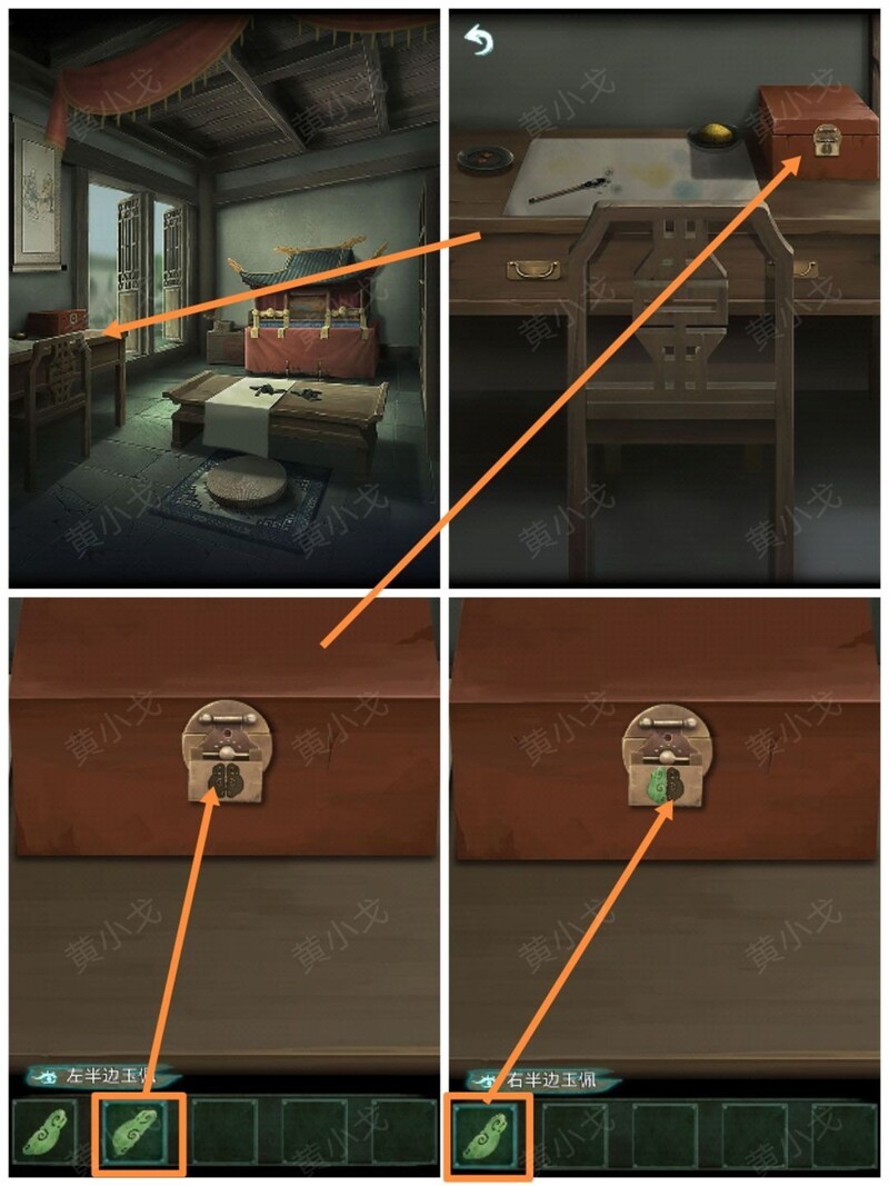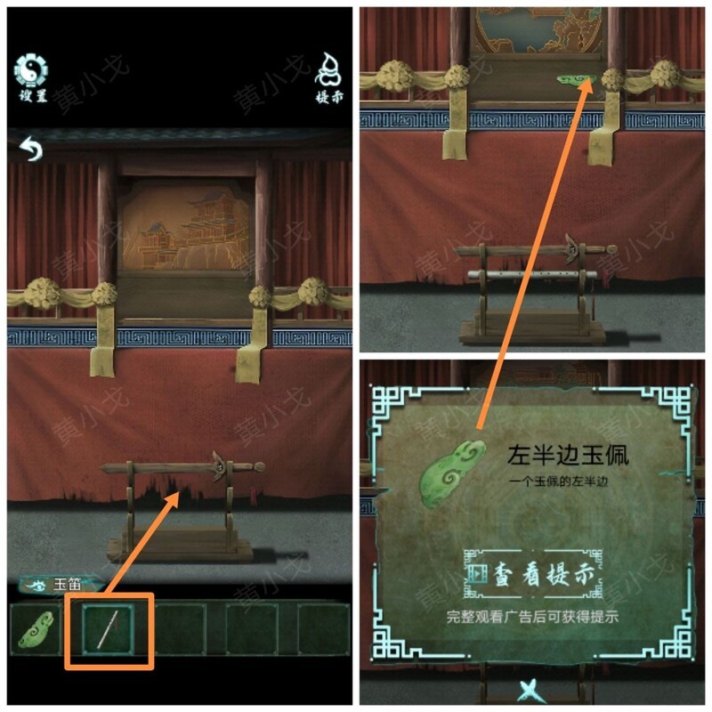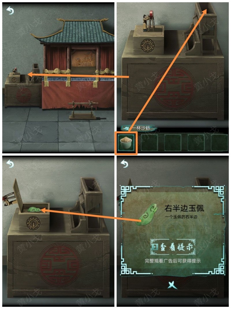 (画面显示房间内)点击戏台旁的沙漏,放入一杯沙砾,启动机关后打开盒子,取得右半块玉佩。