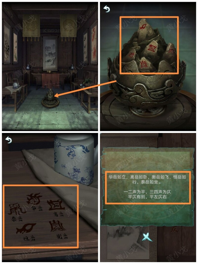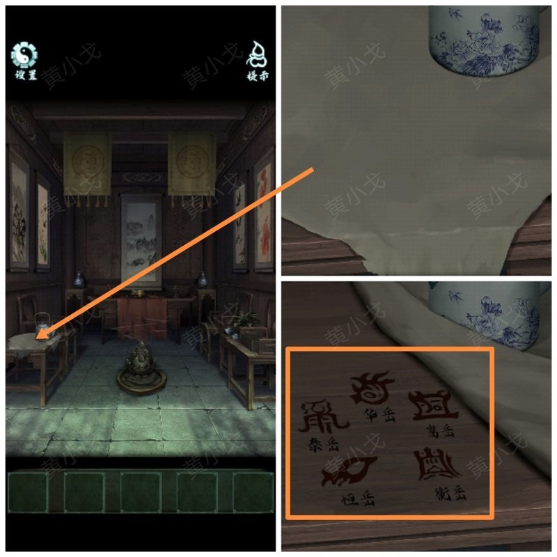 在前厅点击左侧桌子,揭开桌布,获取五岳及其符号的线索。