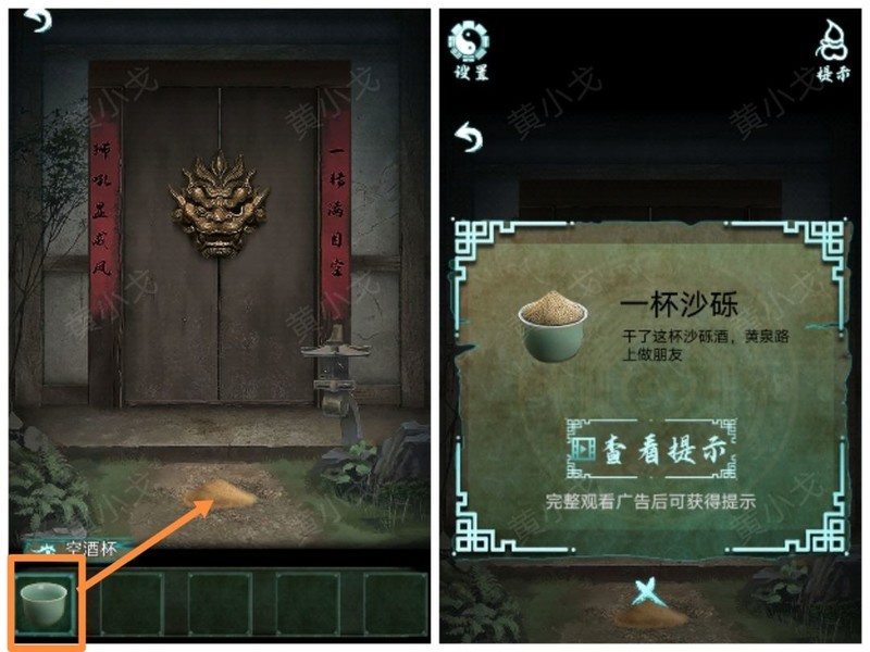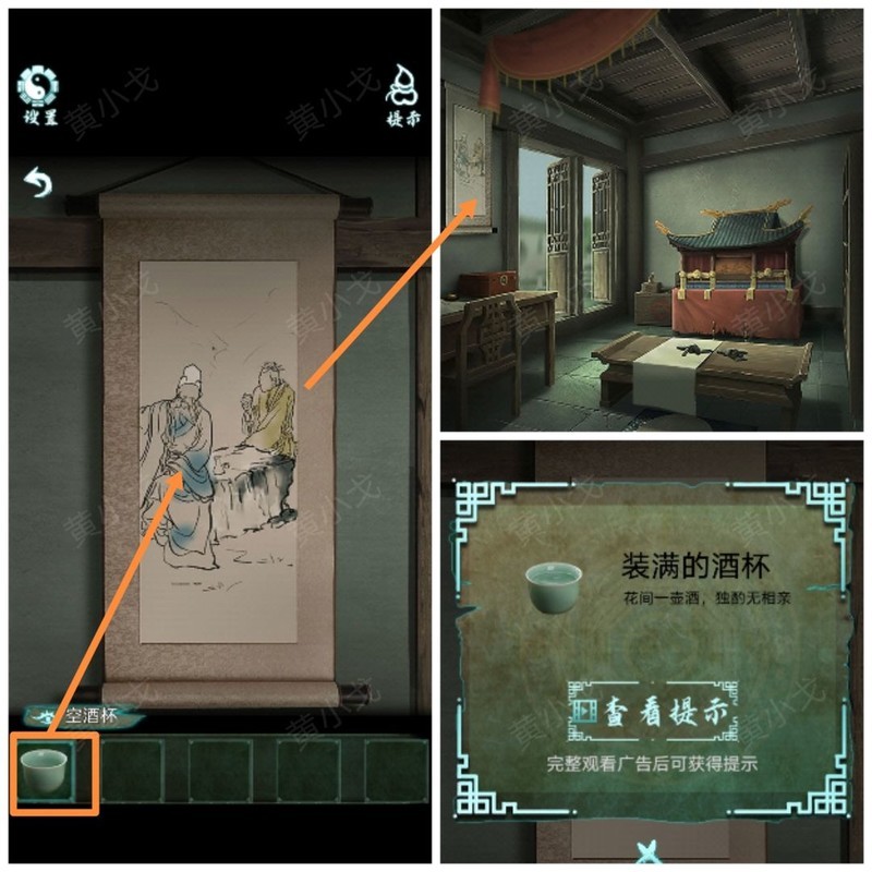 点击墙上饮酒图,用空酒杯接画中酒,得到满酒杯。