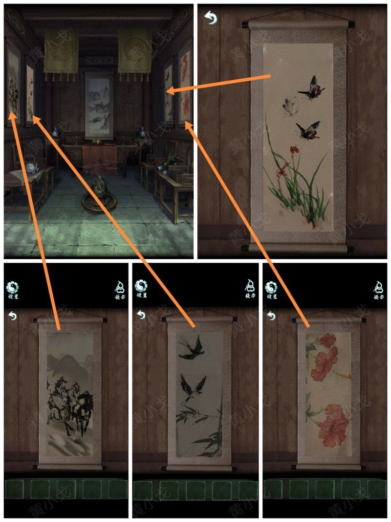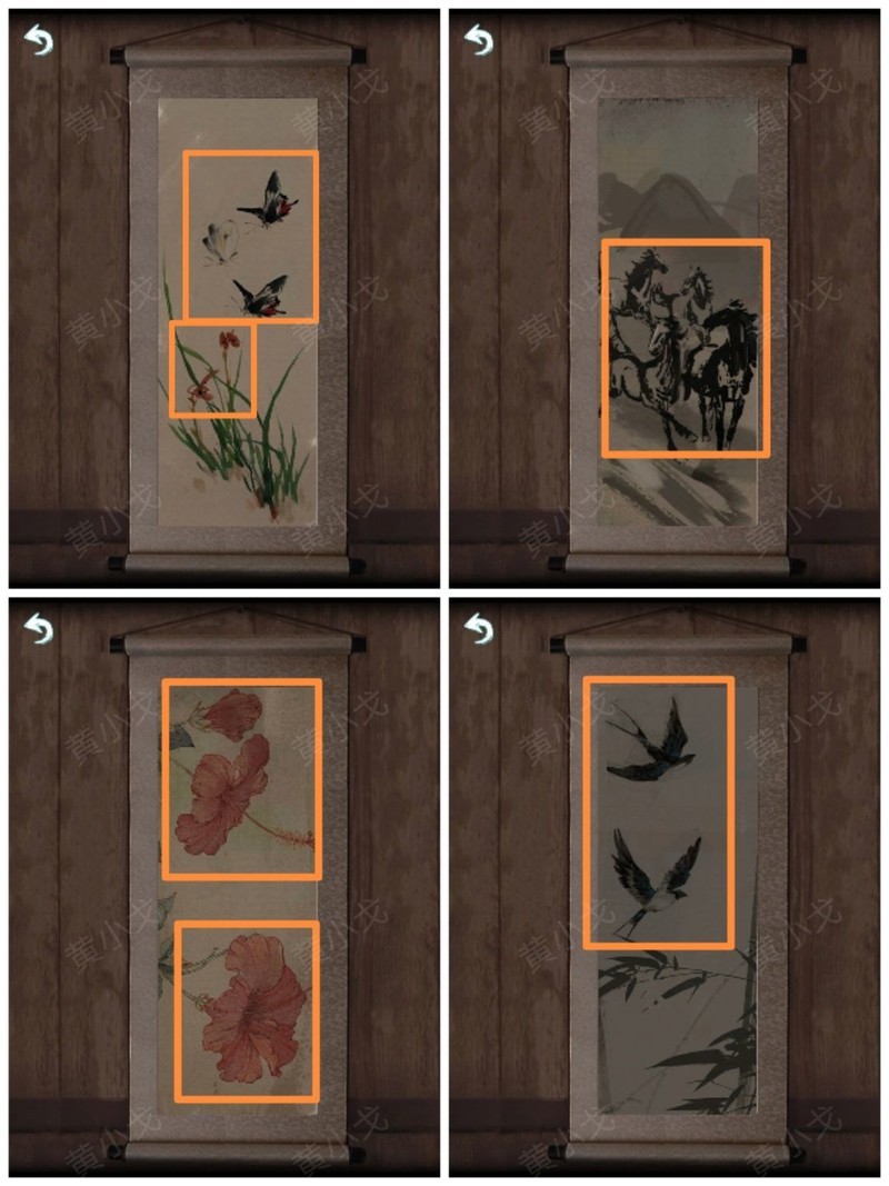 点击右侧椅子上的盒子,根据盒子上的图案提示(蝴蝶、马蹄、花、燕子),参考四幅挂画提供的线索,调节对应滑块的数量位置:蝴蝶对应3、马对应4、花对应5、燕子对应2,注意蝴蝶画中的两朵花也要计入总数。