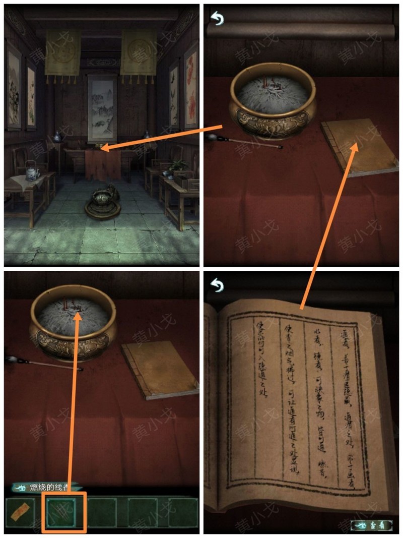 点击供桌查看书籍,将燃烧的线香插入香炉中。