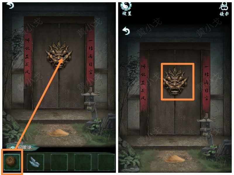 庭院中点击门,为石狮机关安装,转动后开启门。