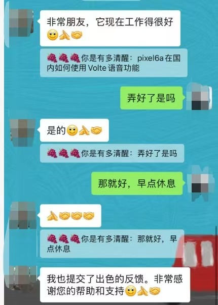 为精准定位问题,工作人员现场开展 “换卡换机” 测试,测试后确定手机卡没有问题,推断问题出在手机终端上。 在查阅大量技术资料,对比同类终端的解决方案后,工作人员终于找到问题的所在,Pixel 6a 手机需要下载两款第三方软件,才能启用 VoLTE 功能。