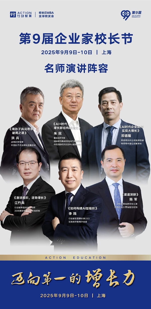 除了9月9日的核心议程,行动教育董事长兼CEO李践还将分享《如何构建AI型组织》,中国孙子兵法研究会副会长洪兵也将带来深度洞见,从微观组织管理到战略思维拓展,为参会者补充更多元的增长视角。