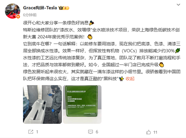 此前,特斯拉维修团队的“漆改水、效增绿”全水喷涂技术项目,荣获上海绿色低碳技术创新大赛2024年度优秀示范案例!