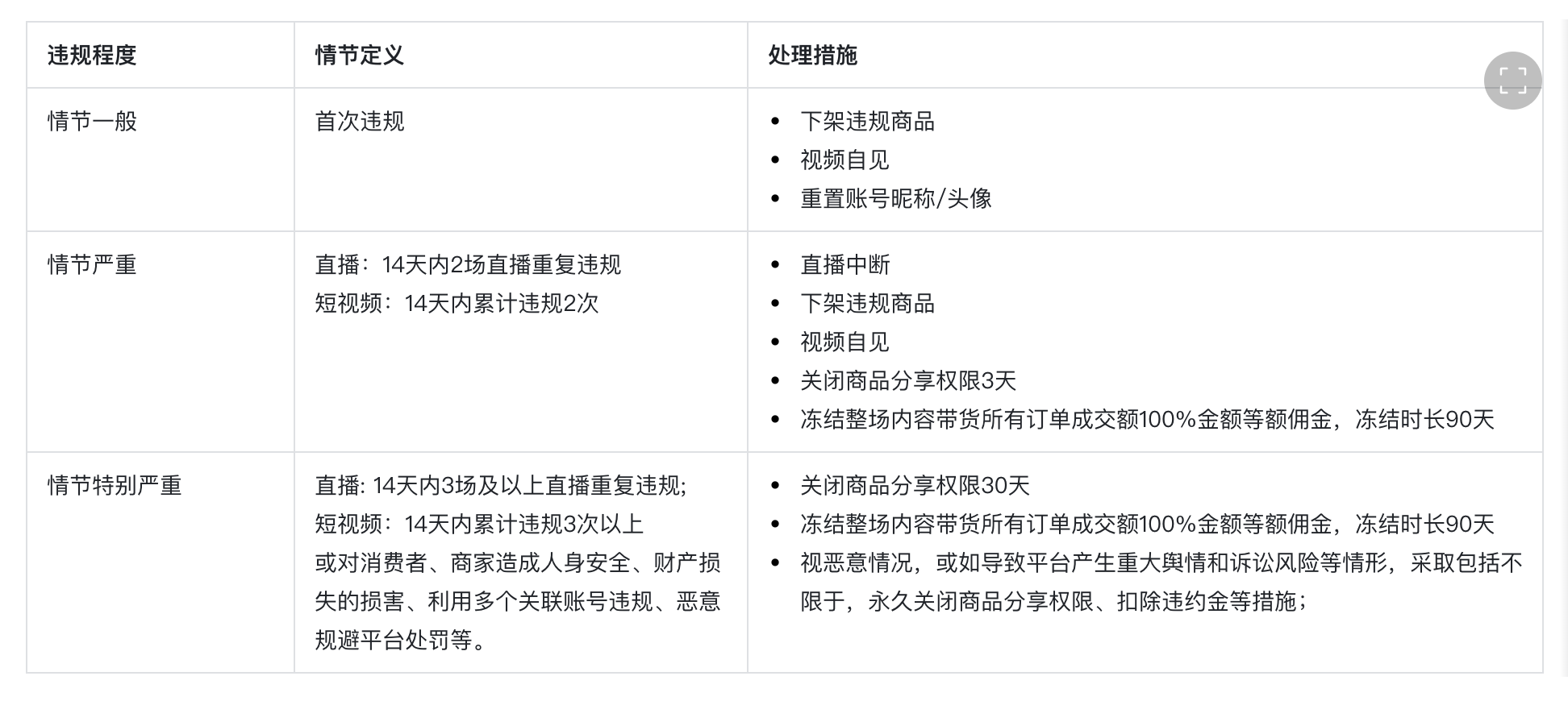 对商家来说,首次违规,平台将处以商品下架、重置移除违规信息等措施。情节一般(第2次违规)、情节严重(第3次违规),处罚措施包括商品封禁、冻结商品货款90天、店铺限制发品7天。特别严重的商家(4次及以上、相关商品销量大等),将被处罚“封禁商品、冻结商品货款90天和停业整顿30天”等措施。
