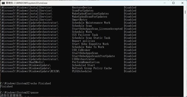 我们双击disable updates.bat,此时会弹出用户控制弹窗,点击允许即可。该脚本并没有用户界面,而是命令行。等到命令行最下方出现“请按任意键继续”,说明执行完毕。
