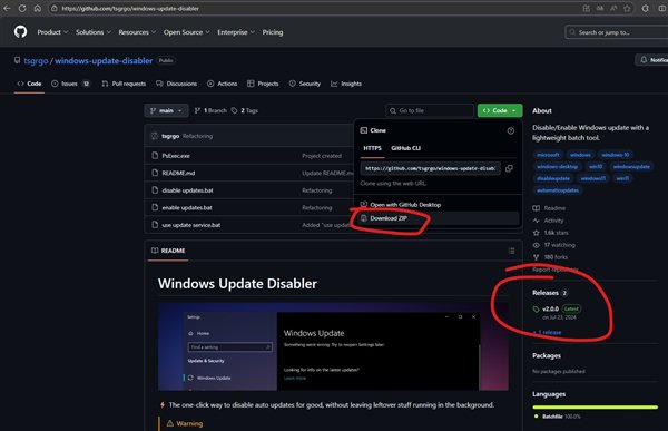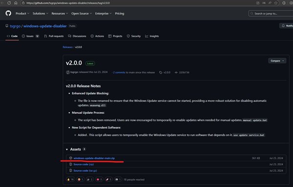 下载方法与上面的一样,都是点击绿色的Code按钮,下载ZIP。Windows Update Disabler还有另一种下载方式,即在Github的页面上,点击右侧“Releases”下方的超链,在跳转页面的下方,点击windows-update-disabler-main.zip也能够下载。两种下载方式所下载的文件是一样的。