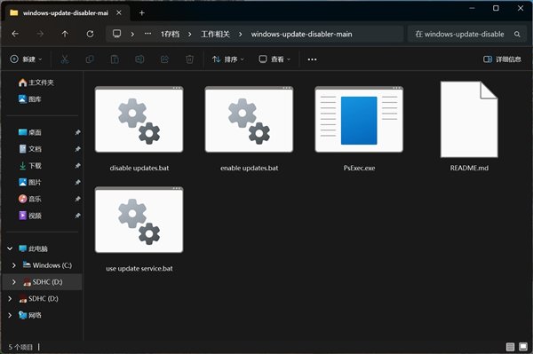下载之后解压,就能看到五个文件,其中三个是脚本,后缀为bat。“disable updates.bat”这个文件为禁止更新,“enable updates.bat”为启用更新,“use update service.bat”为启用更新服务。