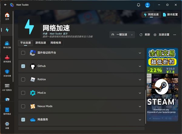 搜索引擎中搜索“Watt Toolkit”就能找到官网。软件完全免费,不登陆也能用,安装之后勾选对应的平台,点击一键加速即可。