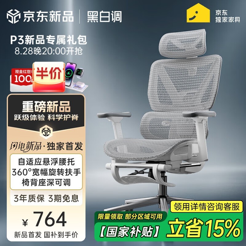 黑白调P3-霜白人体工学椅低至764元