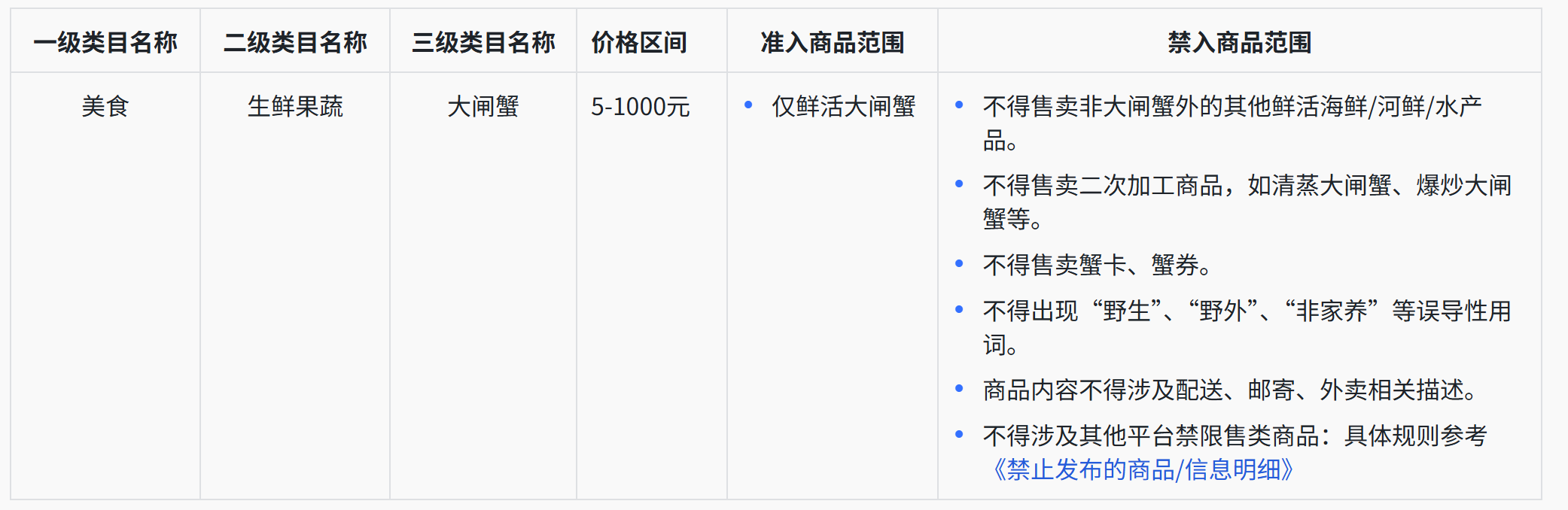商品类型仅限鲜活大闸蟹,禁止售卖非大闸蟹外的其他鲜活水产品、清蒸大闸蟹等二次加工商品,以及蟹卡、蟹券,特别要求产品不得涉及“野生”、“野外”、“非家养”等误导性用词和配送、邮寄、外卖等相关描述。目前仅支持团购券一次性核销服务。商品价格区间为5-1000元。