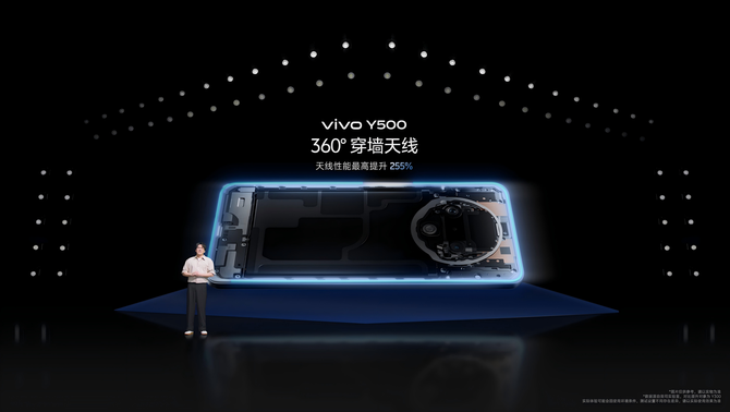 通信能力是vivo Y500的另一大亮点:突破性的360°穿墙天线布局,将多达20根天线布满整个中框,使整体信号接收最高提升255%。通过AI网络智选功能,vivo Y500可在电梯、地库等弱网场景下切换至更好的网络信号,且通过了国家无线电监测中心认证,信号能力达到五星级。