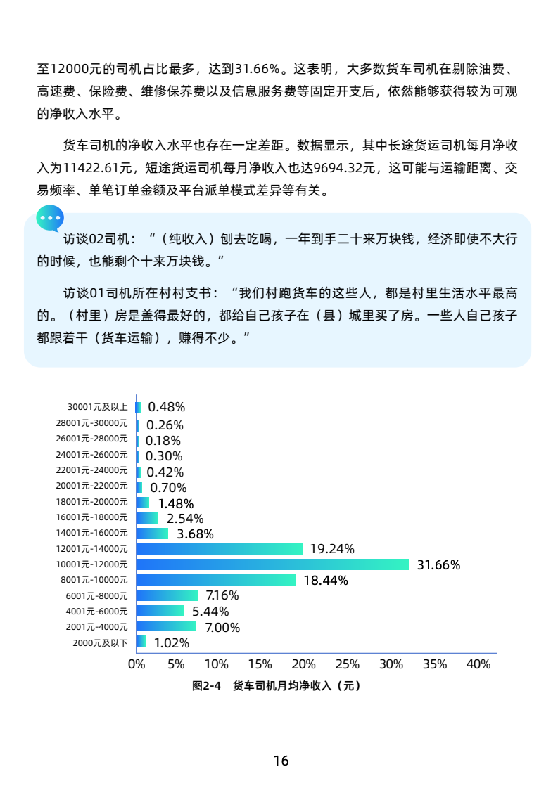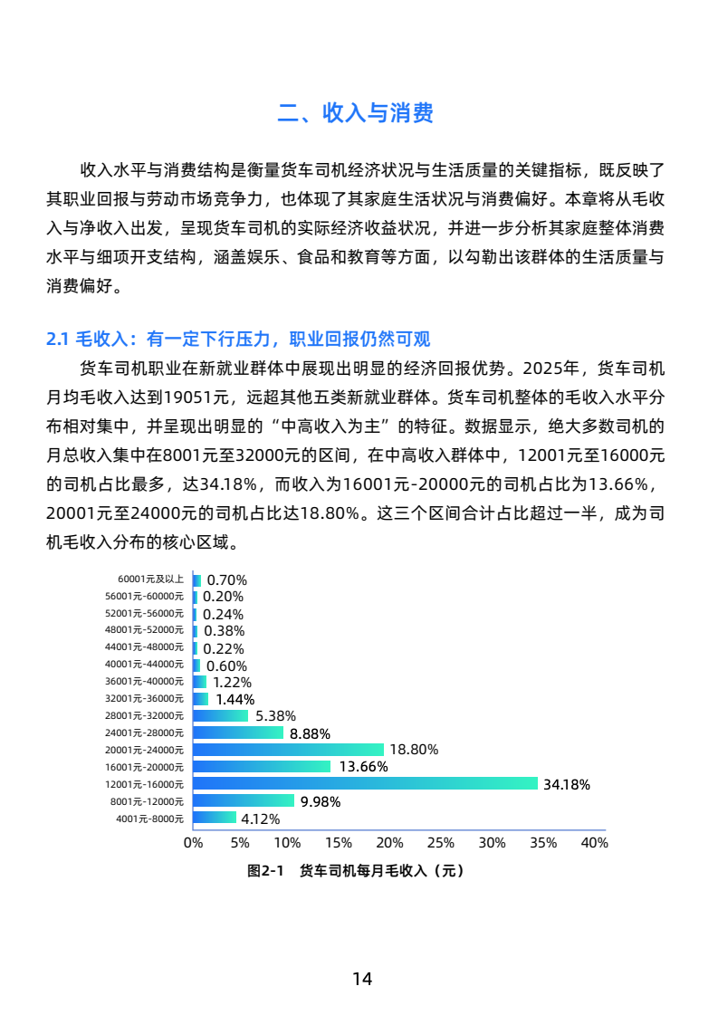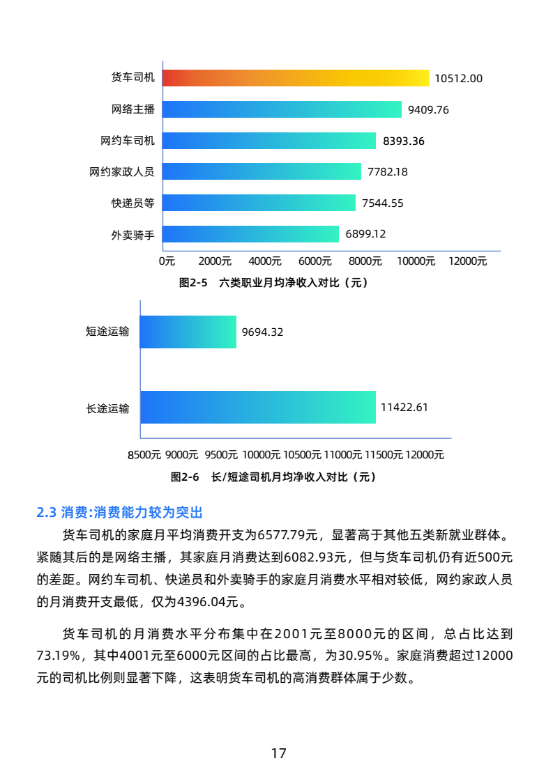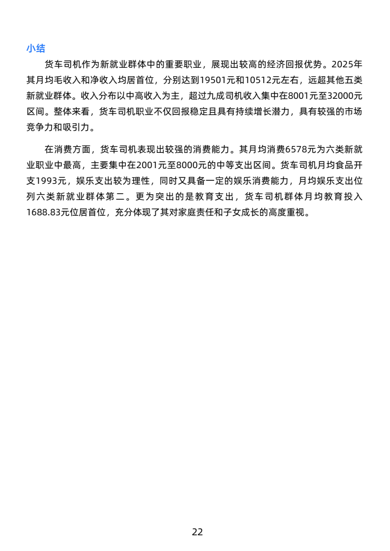 司机月均毛收入19051元,净收入10512元,高于新就业群体,长途司机收入更优。工作强度大,日均工作超10小时,每月休息少于4天,行业高压。