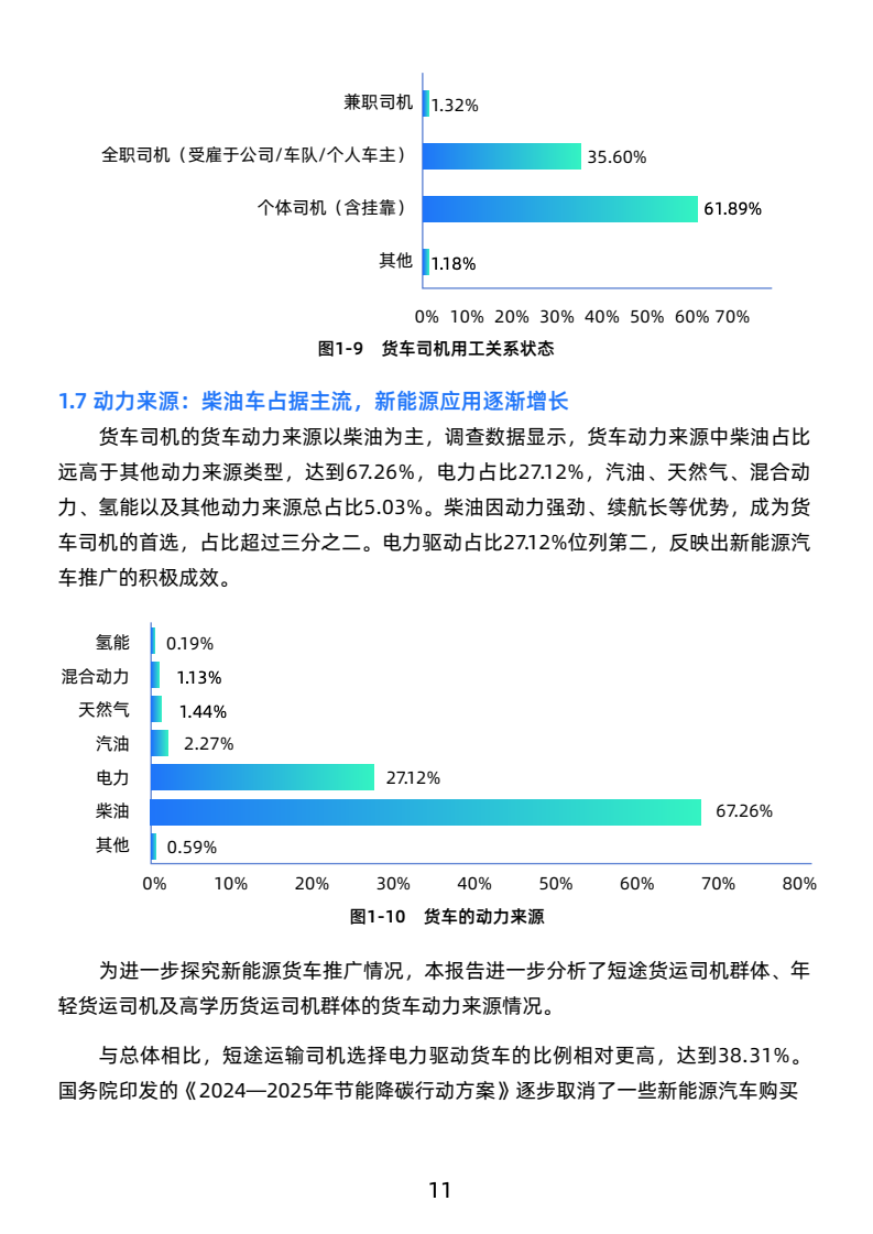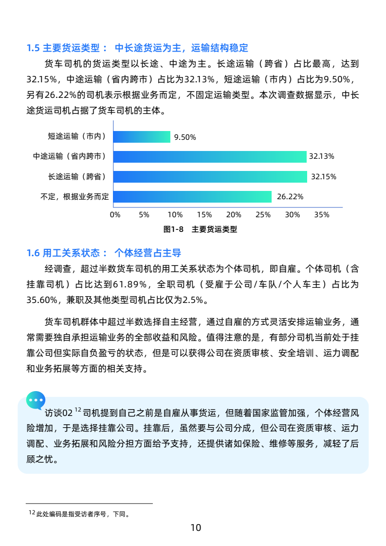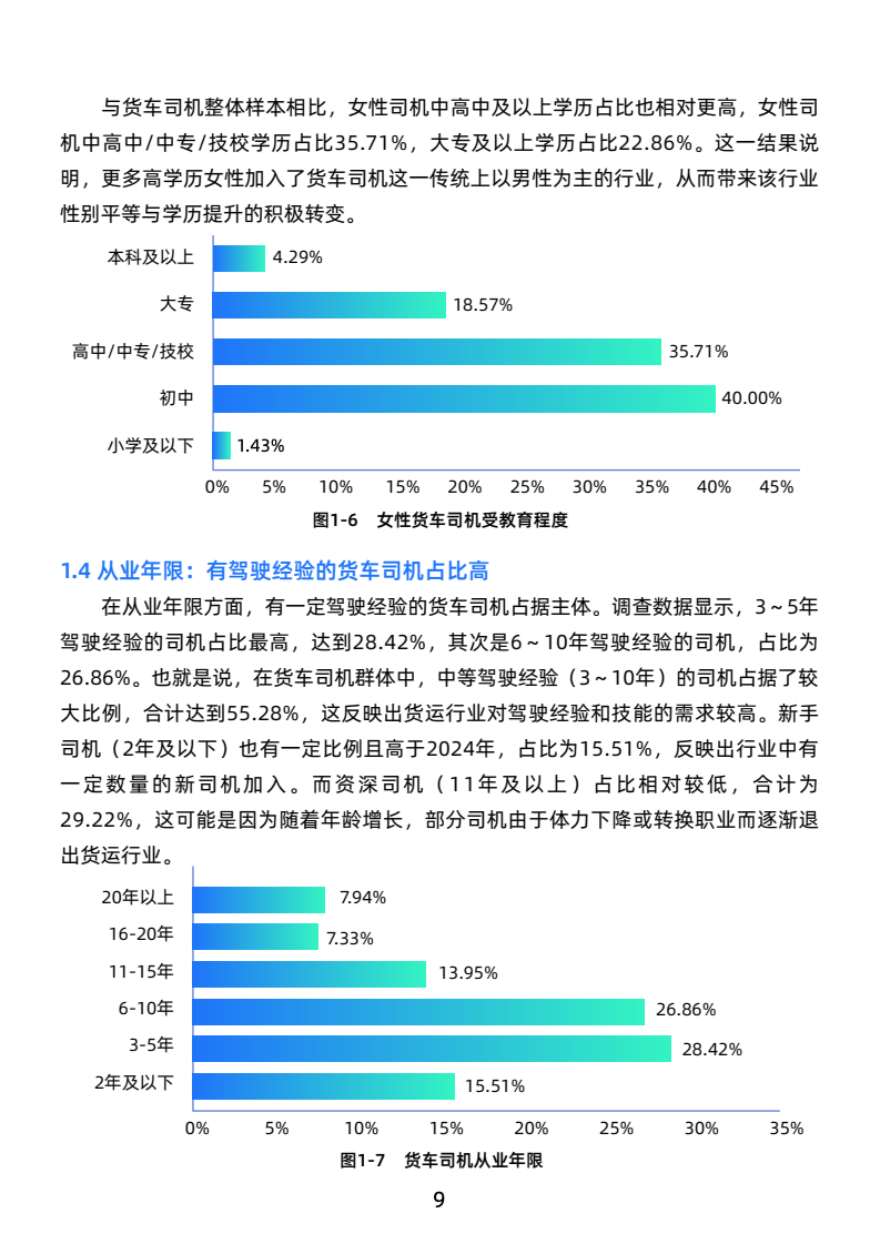 货车司机以中青年男性为主,年龄集中在30-49岁。教育程度偏低,经验丰富,多来自农民或个体经营者。男性占98.35%,女性比例极低。