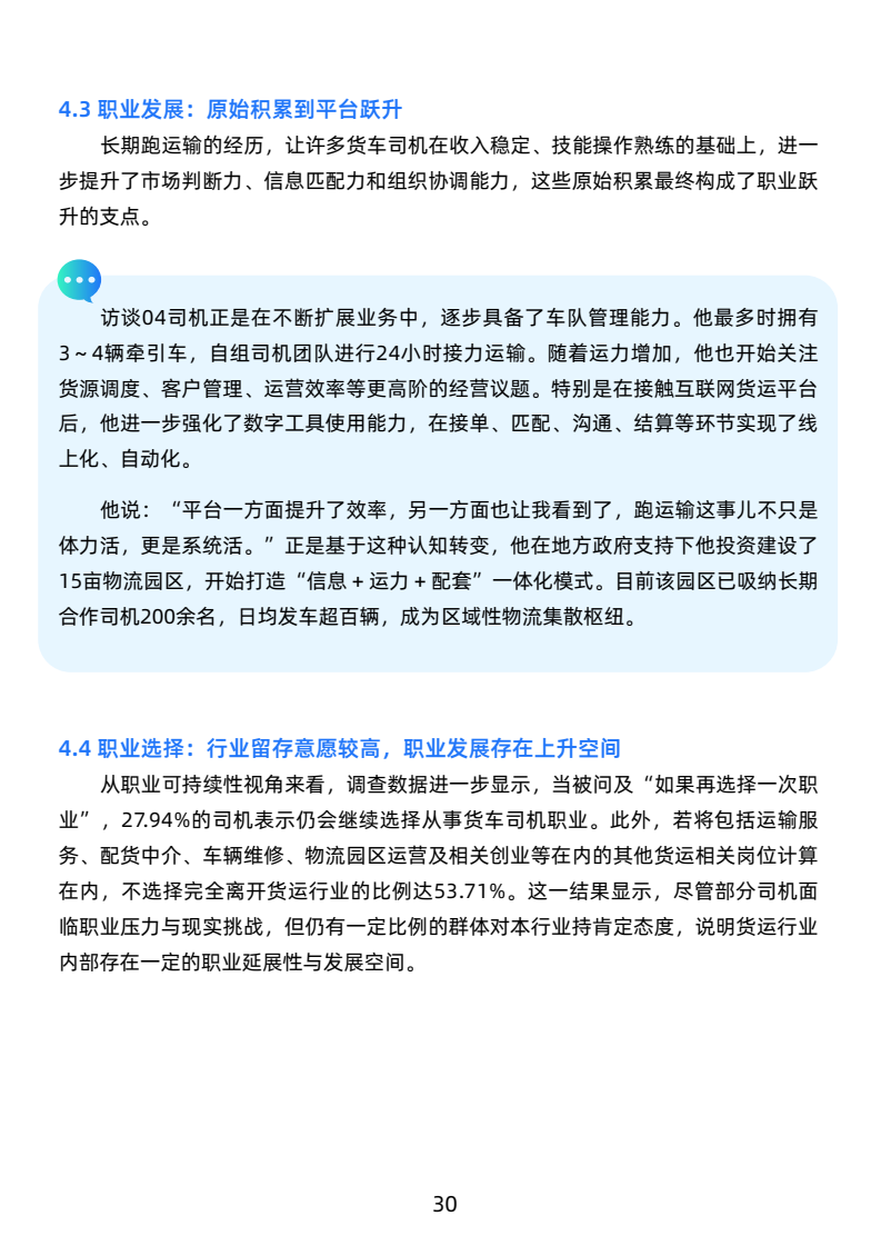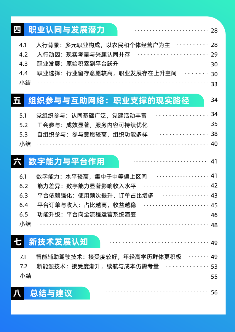 新技术接受度提升,智能驾驶和新能源车受关注,驱动力为安全和成本。职业认同感和留存意愿高,行业吸引力仍在。