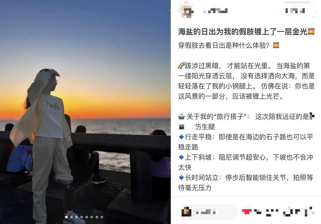 00后女孩万逸雯将这幕穿假肢看日出的图文分享到网络,引发了关注。照片中,她姿态轻松,衣角随风飘荡,裤腿上卷处露出的智能仿生腿泛着金属光泽,与温柔坚韧的朝霞融为一体。