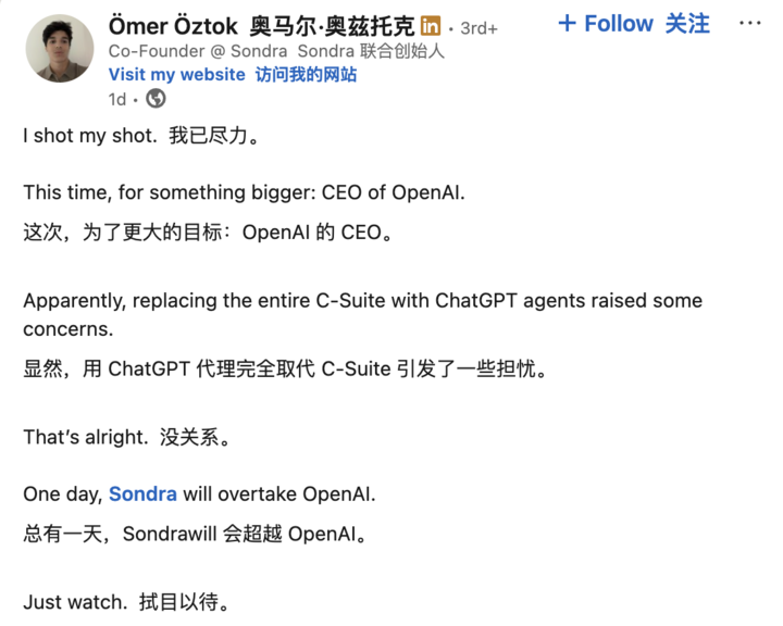 这不,最近海外又出了个营销大整活,网友 Ömer Öztok 声称自己给 OpenAI 投了份申请担任 CEO 的简历。