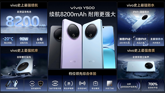 iMobile爱科技9月1日讯——今日vivo Y500正式发布,搭载vivo史上最强8200mAh超薄蓝海电池,支持IP68/69/69+满级防水能力,金刚磐石架,耐用实力全面提升。vivo Y500拥有旗舰级外观设计、360°穿墙天线,以及全景环绕立体声等创新体验,致力于成为新一代国民旗舰手机。
