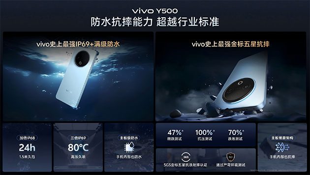 vivo Y500拥有vivo史上最强IP68/69/69+满级防水,不仅通过1.5米的水深中持续浸泡24个小时测试,还能够通过6分钟喷水口压强相当于100倍大气压的80℃高温喷水测试。