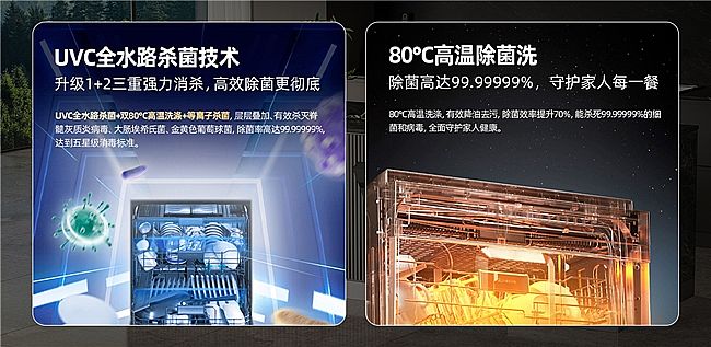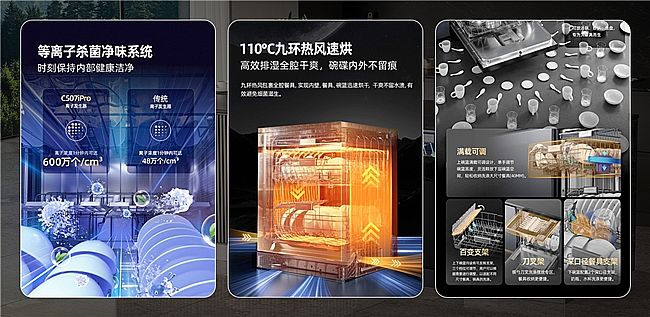 不仅如此,C507iPro还配备了双80℃高温消毒技术,这一高温处理不仅能有效去除餐具上的顽固油污和食物残渣,还能持续杀灭常见的致病菌。加上600万/cm³负离子净味杀菌,确保每一件餐具都能达到严格的卫生标准,为家庭成员的健康筑起一道坚实的防线。