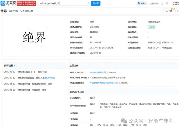 据企查查App信息显示,华为申请注册的“绝界”商标刚刚获批通过: