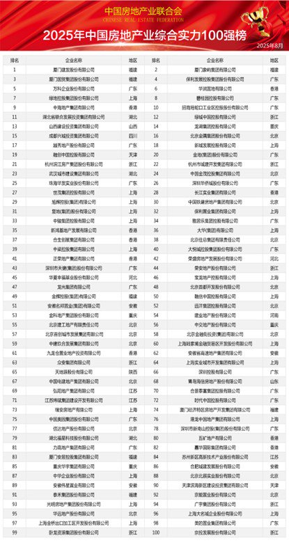 近日,由中国房地产业联合会主办的2025中国房地产业综合实力100强榜单正式发布。此次榜单的揭晓,吸引了行业内外的广泛关注,为观察中国房地产市场的发展格局提供了重要参考。