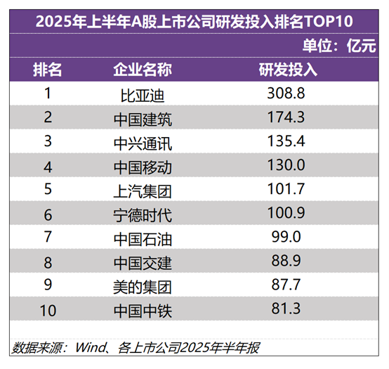 数据显示,2025年上半年,比亚迪营业收入3713亿元,同比增长23%;归母净利润155亿元,同比增长14%。而比亚迪研发投入高达309亿元,是同期净利润的近两倍,同比增长53%,再度成为A股上市公司的“研发之王”。