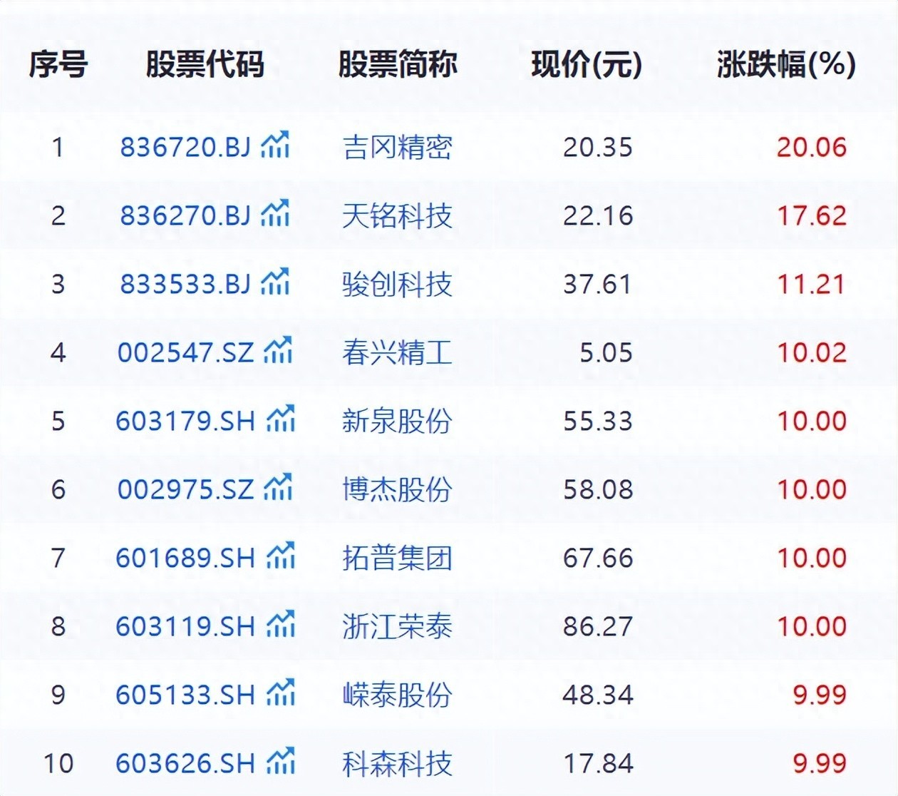 9月2日下午,特斯拉概念板块异动,截至收盘,吉冈精密(836720.BJ)、春兴精工(002547.SZ)、博杰股份(002975.SZ)、新泉股份(603179.SH)、拓普集团(601689.SH)、浙江荣泰(603119.SH)、嵘泰股份(605133.SH)、科森科技(603626.SH)等多股涨停,天铭科技(836270.BJ)、骏创科技(833533.BJ)涨超10%,超捷股份(301005.SZ)、泰德股份(831278.BJ)、先导智能(300450.SZ)、五洲新春(603667.SH)等涨超7%。