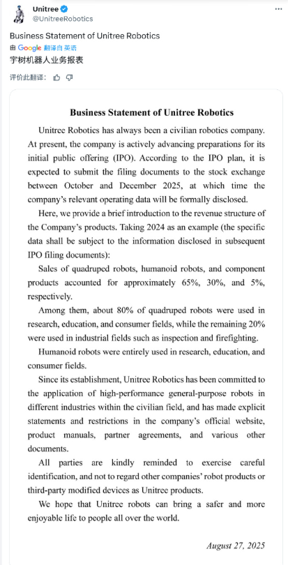 快科技9月2日消息,据媒体报道,今日,宇树科技在社交平台X发文披露机器人业务声明称,公司一直是一家民用机器人公司,根据IPO计划,将在今年10月至12月之间提交上市文件,届时将披露相关运营数据。