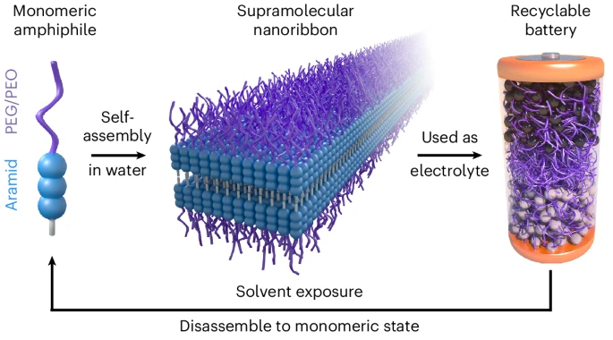 当加入水中时,纳米带会自组装形成数百万条纳米带。这些纳米带组装后会形成凝胶状材料,可以压制成柔性固态电解质。在电池工作过程中,这种材料支持锂离子在电池电极之间流动。然而,当置于有机溶剂中时,纳米带结构会迅速分解,从而可以轻松拆卸电池。