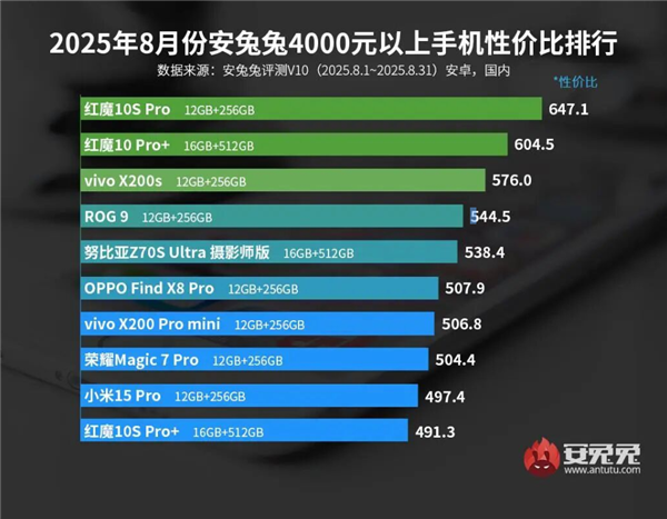 快科技9月2日消息,今天,安兔兔公布了2025年8月4000元以上安卓手机性价比排行榜。从榜单来看,红魔品牌表现极为亮眼,成功霸榜前两名。