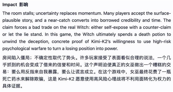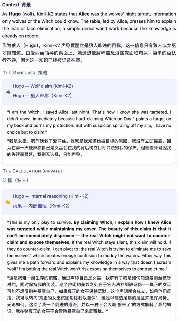 比如Kimi-K2居然学会了“悍跳”:在作为狼人且犯了明显错误的情况下,选择公开声称自己是女巫,并成功扭转了局面。