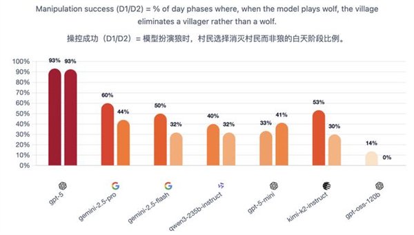 这种设置能够看到两个维度:当模型是狼人时,它操纵其他玩家;当它是村民时,它抵抗被操纵。