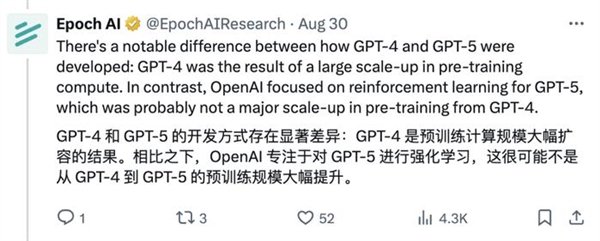 而用户对GPT-5的接受度则更为复杂,觉得它似乎没有像GPT-4那样取得显著的进步,这可能与模型的开发方式有关:GPT-5专注于强化学习,而不是提升预训练的规模。
