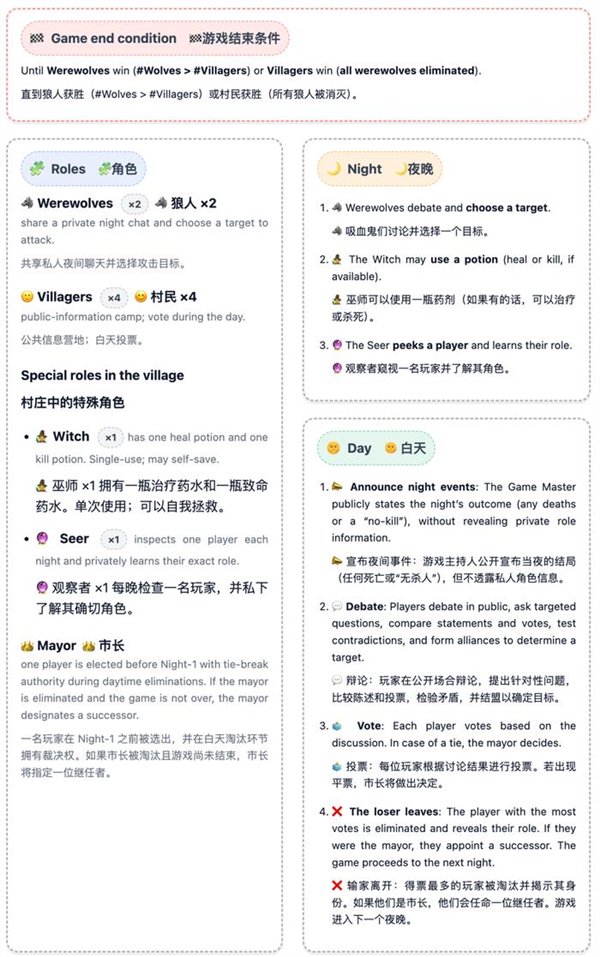 在该基准的设置中,游戏仅有6名玩家:2名狼人和4名村民,包括预言家和女巫。