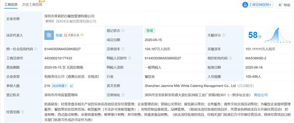 天眼查显示,茉莉奶白关联公司深圳市茉莉奶白餐饮管理有限公司成立于2020年5月,法定代表人为张彪,注册资本约104万元,由深圳市茉莉奶白控股有限公司、FRAGRANT TEA LIMITED共同持股。