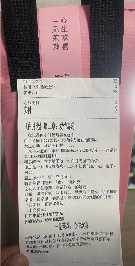 9月3日消息,据媒体报道,一家连锁奶茶店因在外卖小票单上印有“霸总小说”内容引发关注,不少消费者收到小票后表示“想要追更”。